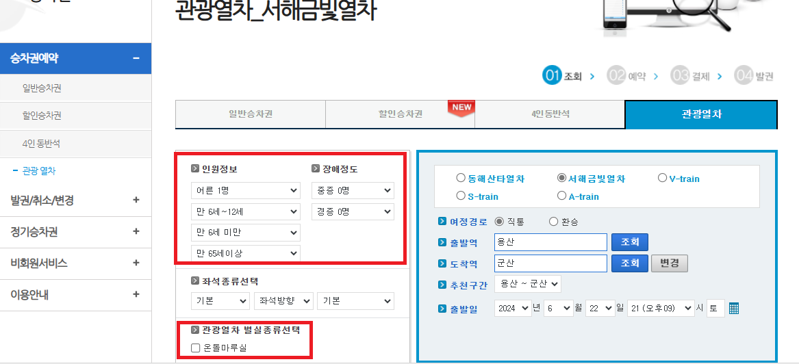 3. 서해금빛열차 예매에서 탑승인원 정보를 입력