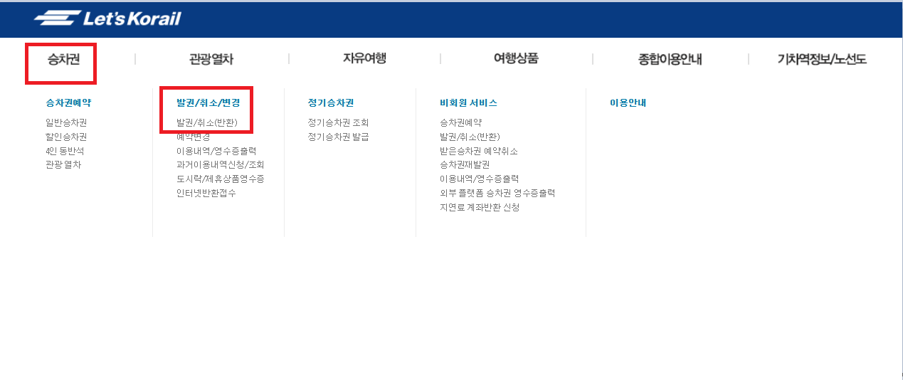 코레일 홈페이지나 모바일앱을 통해 취소 가능하며 상단 메뉴에서 승차권 /발권 취소 /변경에서 처리하실 수 있습니다.