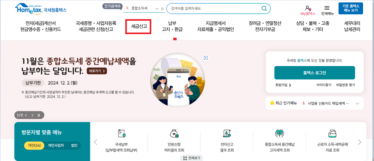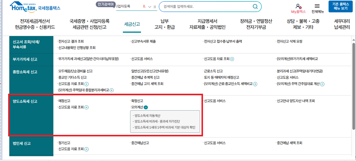 홈택스 메인페이지 세금신고 → 양도소득세 → 예정신고 or 확정 신고 순으로