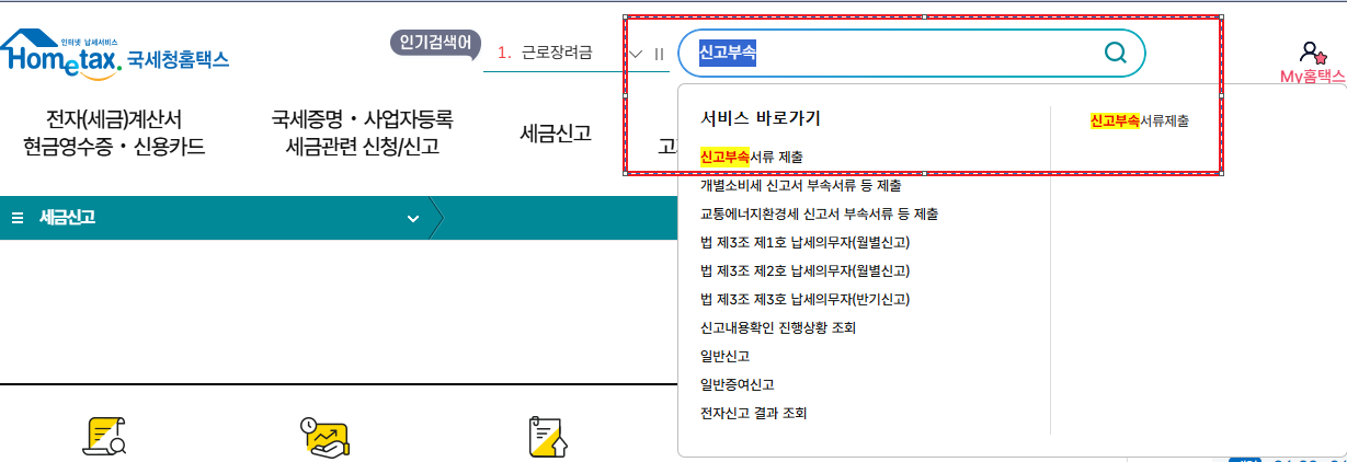 홈택스 내 신고 부속 증빙 서루 제출 메뉴에서 서류를 첨부하실 수 있습니다.